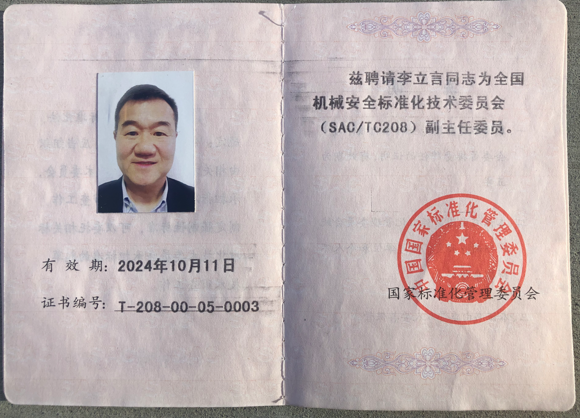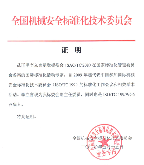 ISO國際標準 (機械安全)TC199/WG-6 Convenor 分組召集人;ISO國際標準 (機器人)TC299/WG-3 工業(yè)機器人安全標準專家。